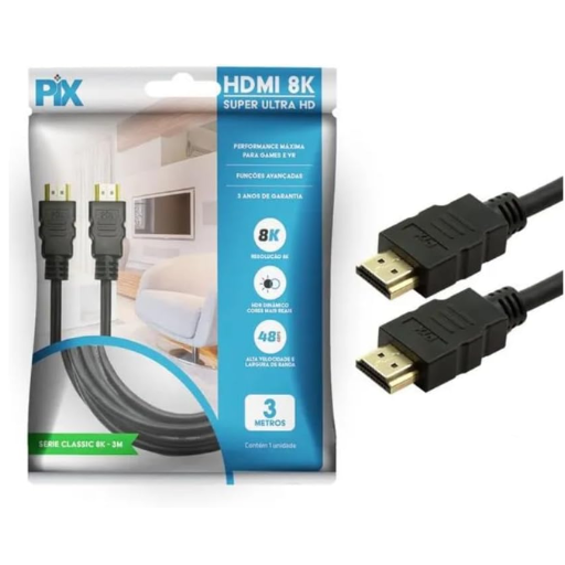 Cabo HDMI Plus 2.1 PIX 8K HDR 19P , da marca PIX, é uma das melhores opções disponíveis. Este modelo se destaca por ser compatível com as tecnologias mais modernas, oferecendo suporte a resoluções de até 8K e aproveitando o potencial do HDR.